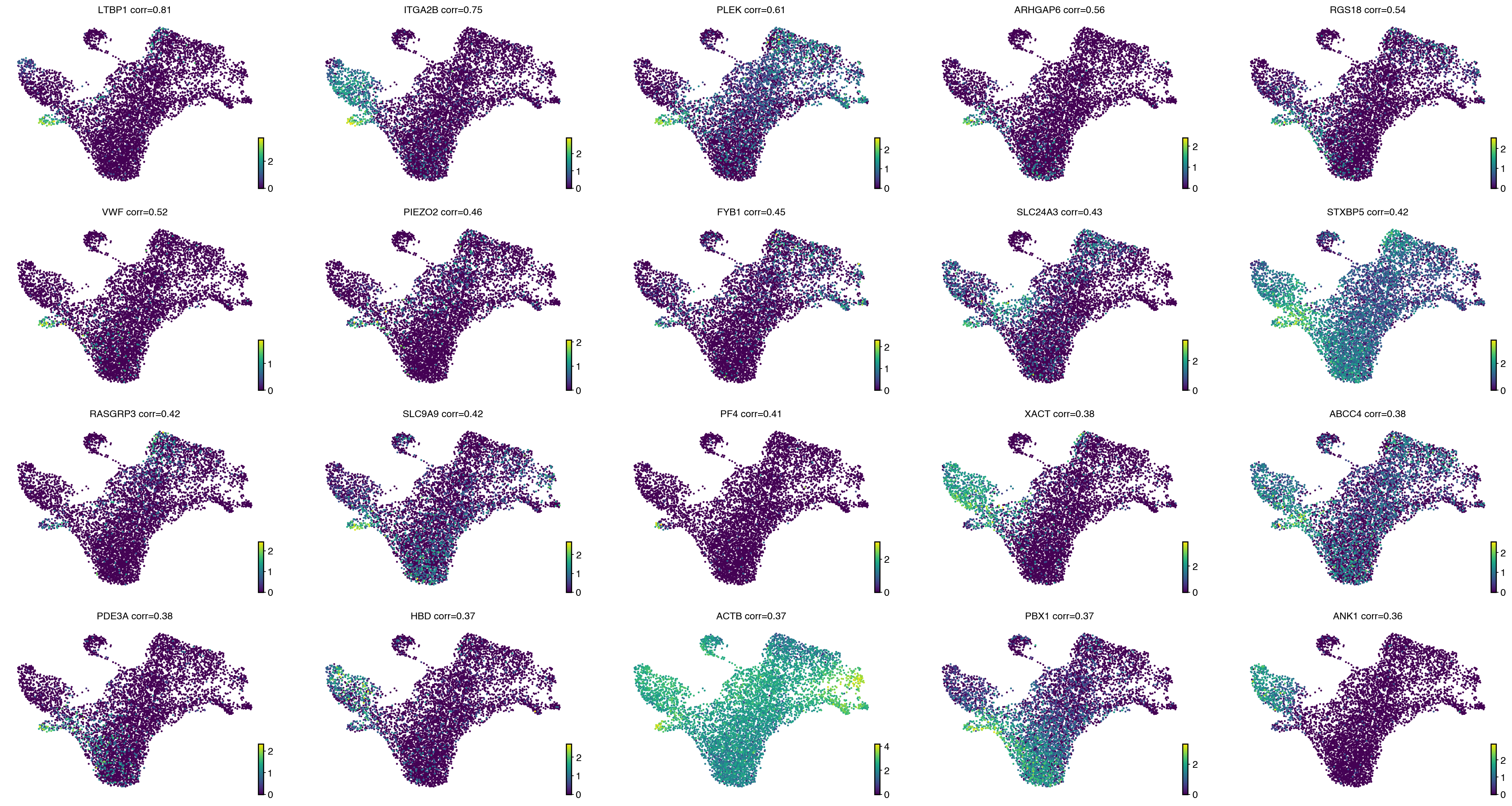 estimator.plot_lineage_drivers(lineage="MEP", n_genes=20, ncols=5, title_fmt="{gene} corr={corr:.2}")