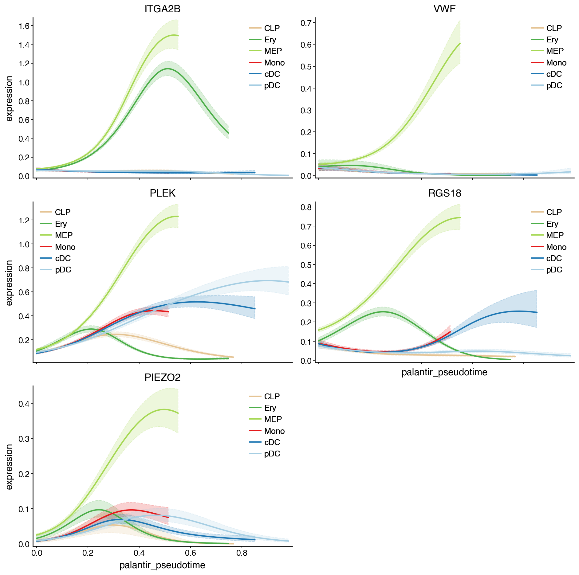 genes=["ITGA2B", "VWF", "PLEK", "RGS18", "PIEZO2"],